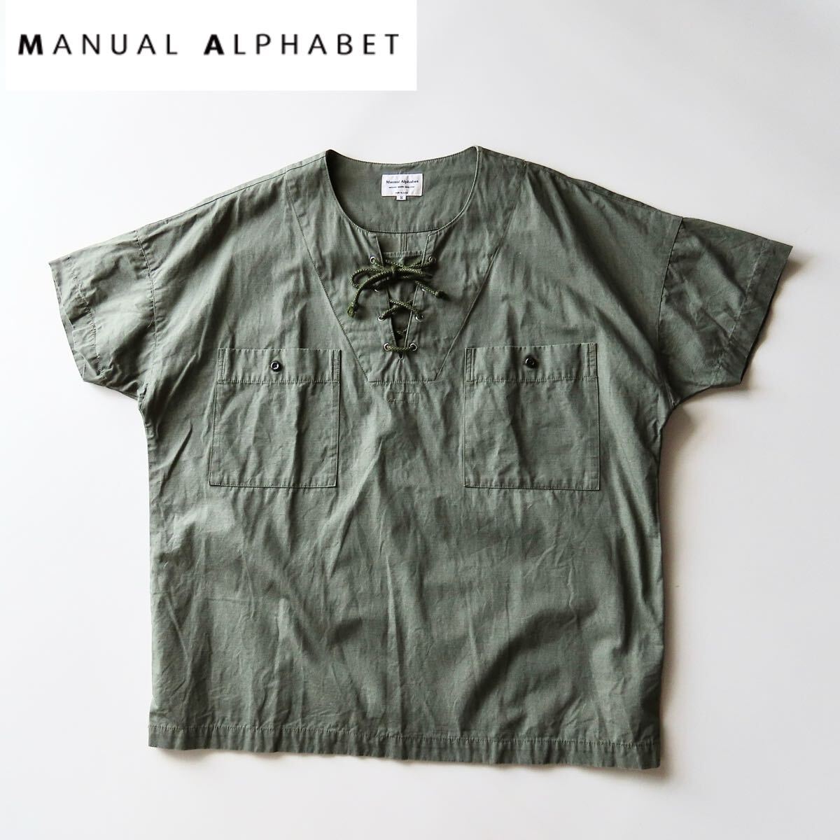 > 美品 Manual Alphabet マニュアルアルファベット コットンヘンププルオーバーシャツ 2 オリーブ系 レースアップシャツ ミリタリーシャツ
