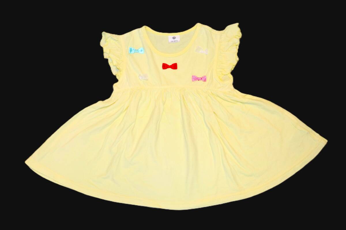 - 綺麗 良品 黄色 フレンチフリル袖カットソー チュニック Tシャツ 5つのサテンリボンが可愛い たっぷりギャザー 130㎝ 120㎝