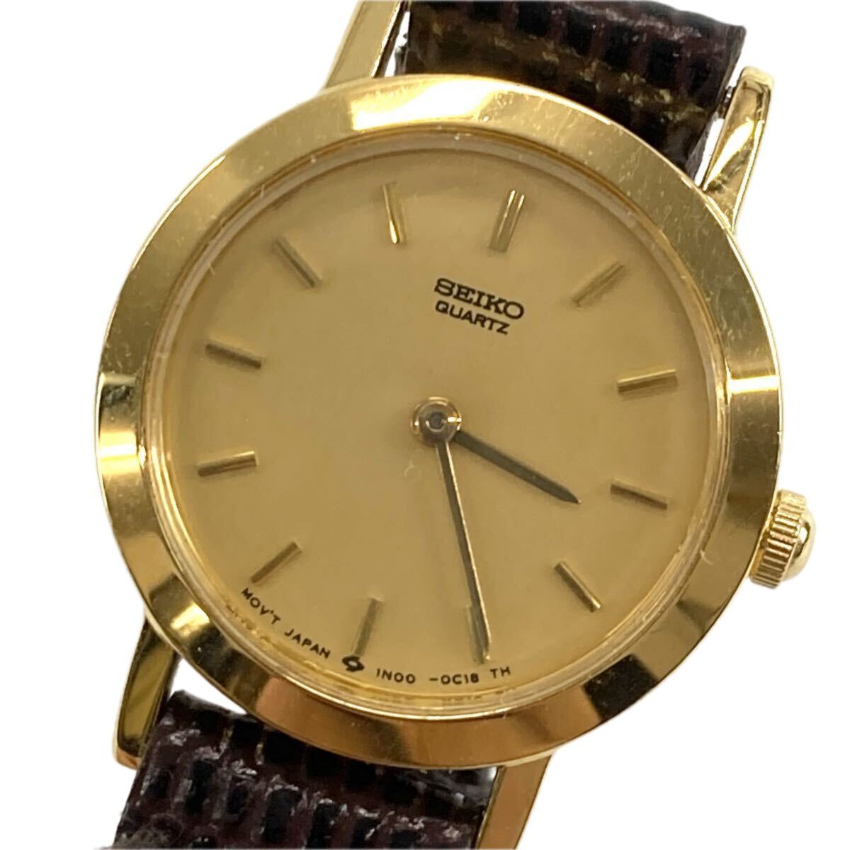 - SEIKO セイコー アナログクォーツ腕時計 ラウンドフェイス ドレスウォッチ 文字盤ベゼルゴールド リザード型押しベルト ブラウン