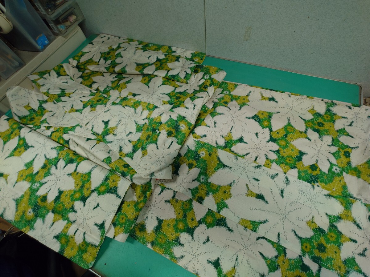 > ●142 華やか レトロポップ 柄 紬 大柄 楓 葉模様 小花 花 可愛い 素敵 白 緑 裏地 ペールオレンジ ヴィンテージ 着物 しつけ糸付 未使用③