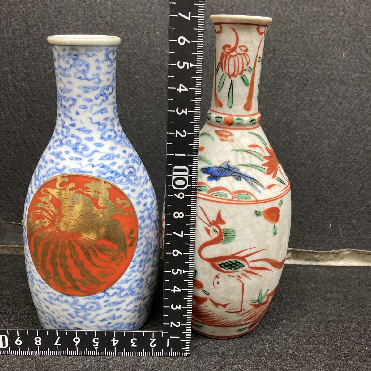 - 京焼き 永楽善五郎造(物故作家) ★染付 赤絵金彩雲鶴絵 徳利 ★赤絵 花鳥、魚絵 徳利 甘手 二客組 アンテーク