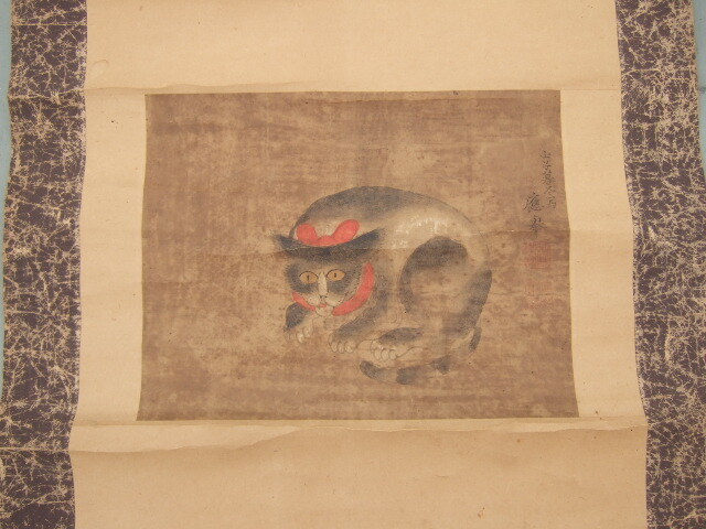 - [模写] 江戸期肉筆または木版彩色「猫」図軸養蚕信仰新田の猫絵日本画日本の素朴絵和猫黒白猫ハチワレ