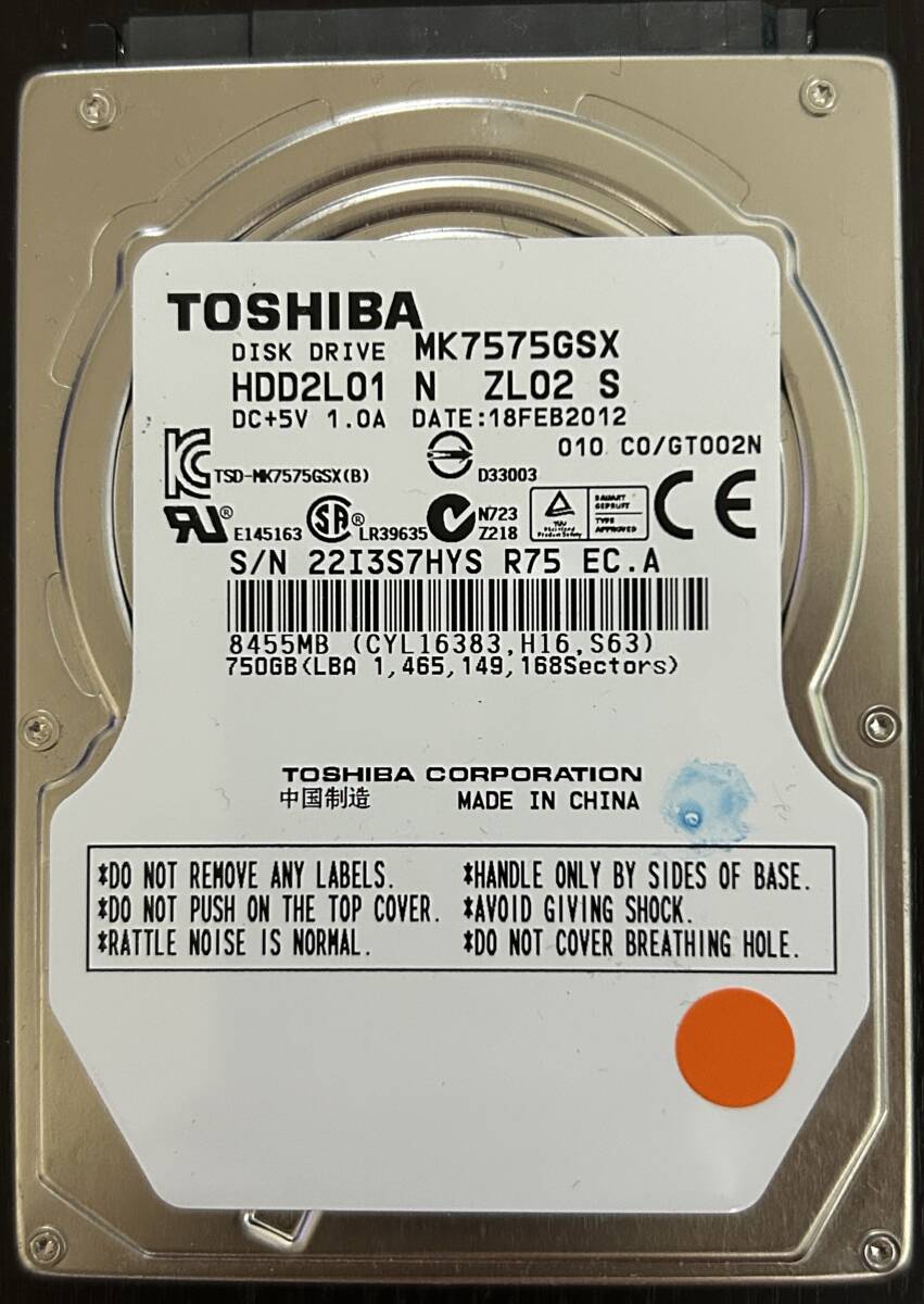 - 即決 中古 TOSHIBA 750GB 使用時間2825時間 2.5インチ 内蔵ハードディスク CrystalDiskInfoにて確認済み 正常 【MK7575GSX】A29