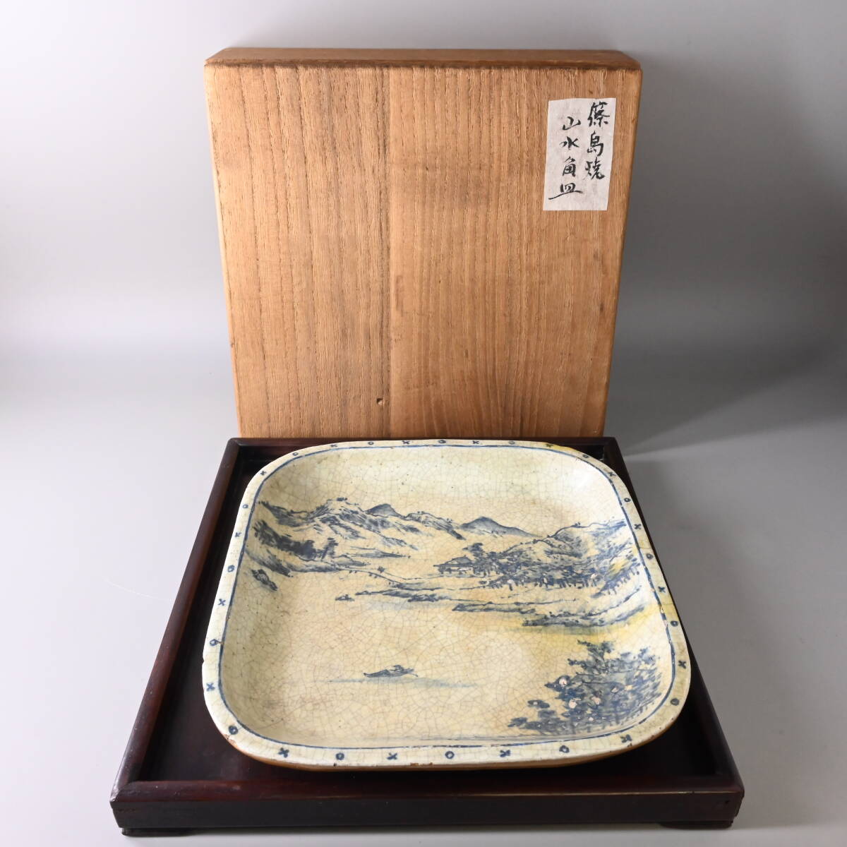 > 113101 希少 篠島焼 笹島焼 楽焼 篠島印 染付山水図角皿 牧朴斎 1800年代造 文化年間 幅18cm 高3cm 江戸時代後期 軟質施釉陶器 尾張国 愛知