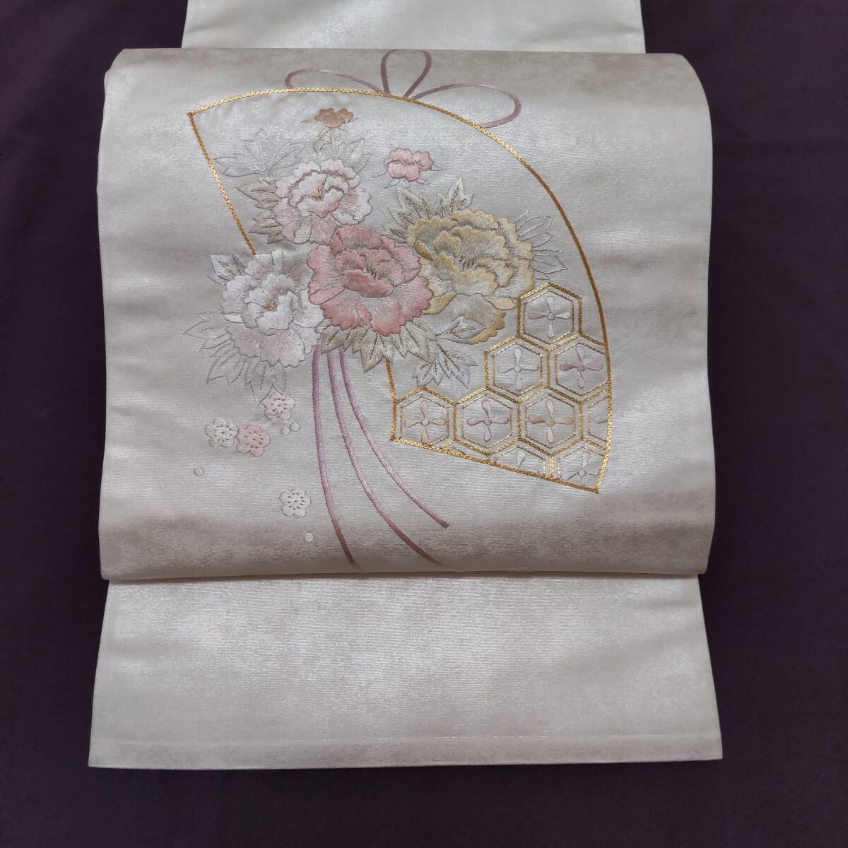 - 貴世 正絹 手刺繍 地紙牡丹梅 袋帯(301)