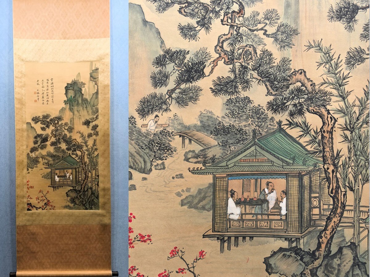 - 「石濤畫 山水人物図」清代画家 肉筆紙本【仁】掛け軸 書画立軸 巻き物 中国書画 古美術 蔵出 畫芯約49×100cm