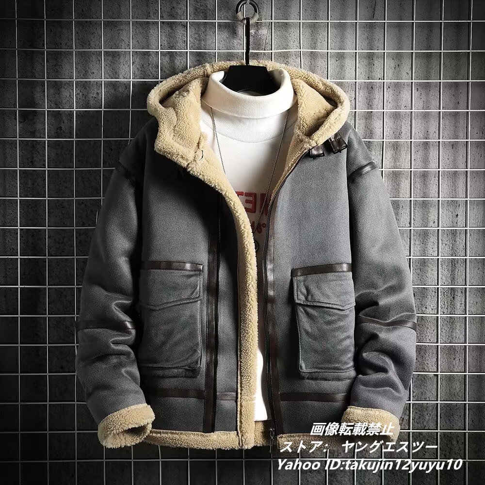 - ムートンコート メンズ 毛皮 ファー フライトジャケット 刺繍 アウター ジャンバーブルゾン 厚手 防寒 グレー 5XL