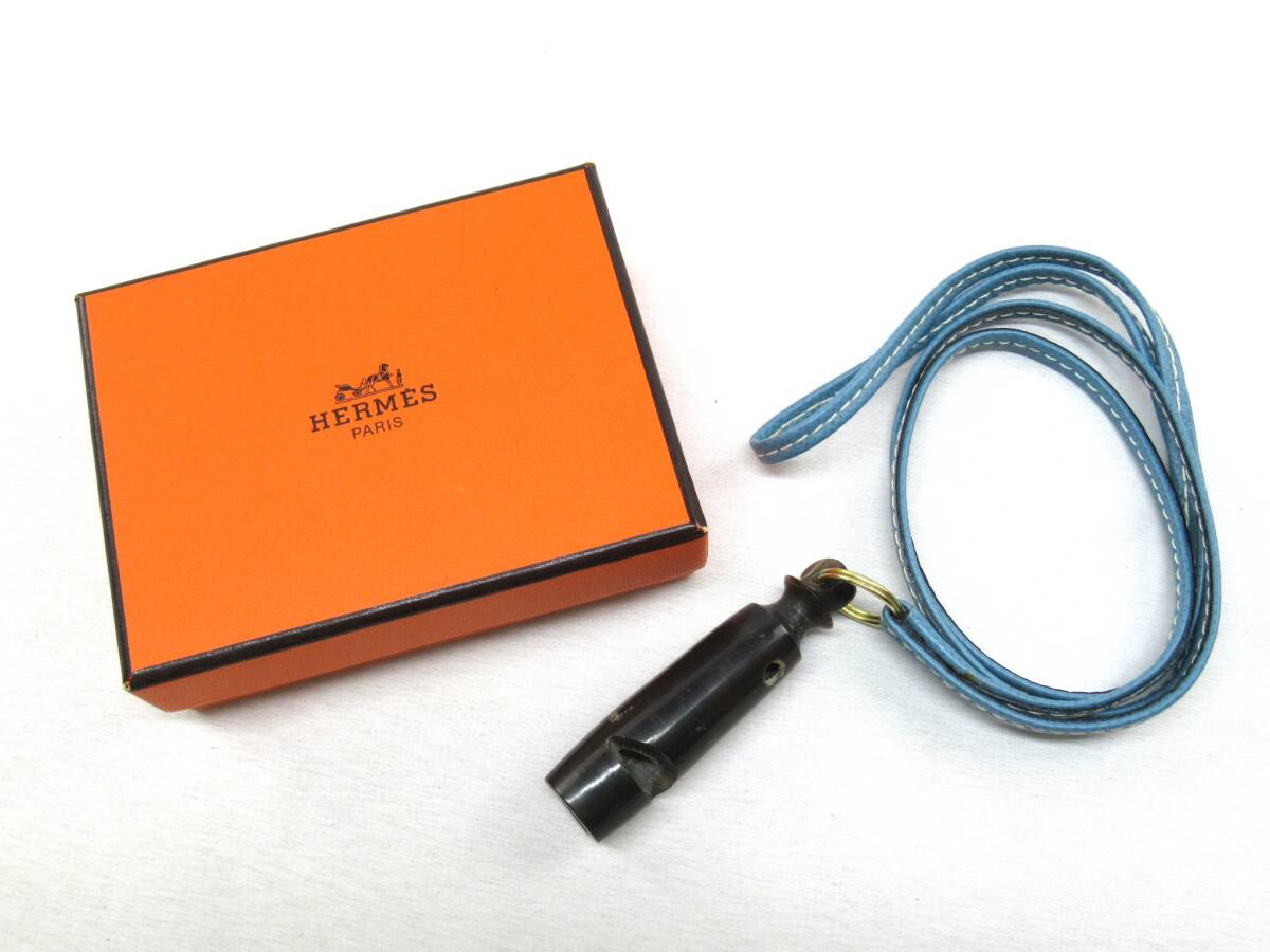 - ★【B送900円】2327 HERMES エルメス シフレ ホイッスル レザー 笛 犬笛 ネックレス ウッド×ブルー フランス製 首周り約98.0㎝