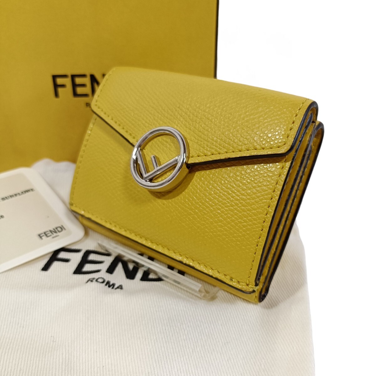 - 【美品】 正規品 箱付き FENDI フェンディ ミニ 折り財布 エフイズ 黄色 革 レザー 三つ折り 保存袋付き カード付き マスタード イエロー