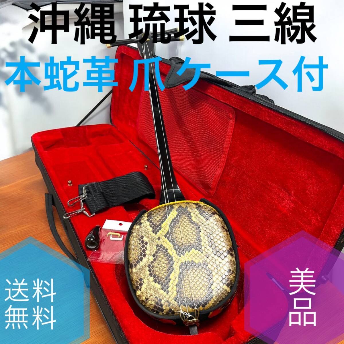 > ☆送料無料 美品 沖縄 琉球 三線 本蛇革 本革 蛇革 本皮 蛇皮 爪 ケース付き 伝統楽器