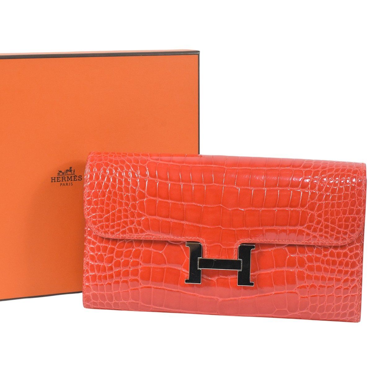 - エルメス 超美品 超豪華 アリゲーター素材 コンスタンスロング クロコダイル 長財布 オレンジ系 シルバー金具 HERMES CONSTANCE