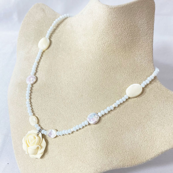 - 送料無料!! シェル 手彫り ビーズネックレス フラワーモチーフ ホワイト 47cm ビーズアクセサリー かわいい エレガント 夏 花◇N-0079