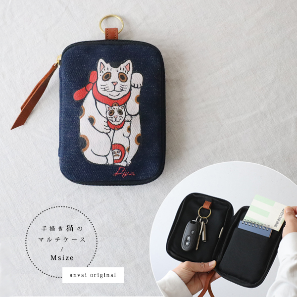 - 芸術の秋SALE Mサイズ 手描きART クッション 厚地インディゴデニム キーケース 通帳ケース 招き猫 フラグメントケース S06A