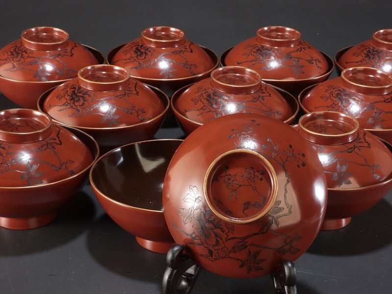 ■【夢讃岐】木製 沈金・吸物椀 10客揃(蓋10枚)Φ120 H55 wa940 ■ 商品詳細 御覧頂き、ありがとうございます。 【夢讃岐】木製 沈金・吸物椀 10客揃(蓋10枚)Φ120 H55 wa940 ○商品状態○経年あります。良い状態です。椀10客揃(蓋10枚)。 状態に関しては,充分に画像で確認の上、クレームの無い様に御入札下さい。 ○サイズ○ Φ--mm/高さ--mm ぐらい画像参照ください。 ○御一読下さい○2025年で、昭和100年です。私共の扱う品は、大半の物が半世紀から一世紀以前の品です。 新品と表記しない限り,確実に経年有りますので, 新品とは違い、擦れアタリ等は有るとお考え下さい。 また細かい見落とし等も時代古物とお考えの上御容赦下さい。 気になる箇所は、画像にもアップ致しますので、ご了承の上御入札下さい。 記載・画像掲載されてない,見落としに関しては、常識の範囲で誠意対応致します。 他にも漆器をメインに出品しておりますので、ぜひ御覧下さい 。