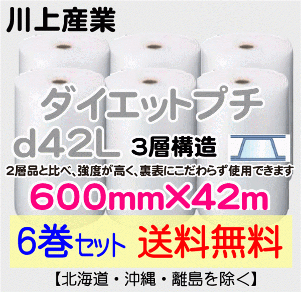- 【川上産業 直送 6巻 送料無料】d42L 600mm×42m 3層 エアークッション エアパッキン プチプチ エアキャップ 緩衝材