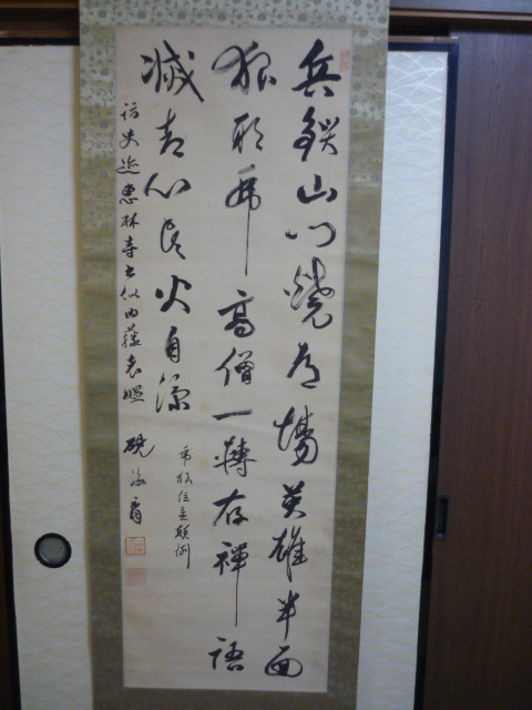 - 【模写】 掛軸 大岡育造 書 絹本 大きさ全体約192cmx54.5cm 絹本部分約129cmx42cm 合わせ箱あり