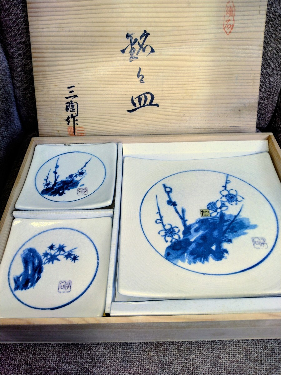 - K340【未使用/長期保管】 侑石 銘々皿 三陶作 木箱 和食器