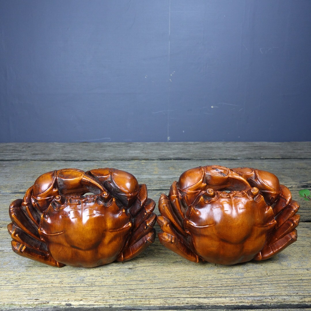 - 『館蔵珍品 黄楊木製 細密彫 八方來財一對 置物 賞物』稀少珍蔵品 古賞物 貴重物品 収蔵品 中国古美術 時代物 古董品