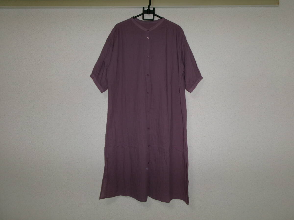 > terawear emuテラウェアエム☆紫パープル濃いめくすみラベンダーふんわり♪半袖シャツワンピース☆ナチュラル涼しい♪コットンガーゼ素材 L
