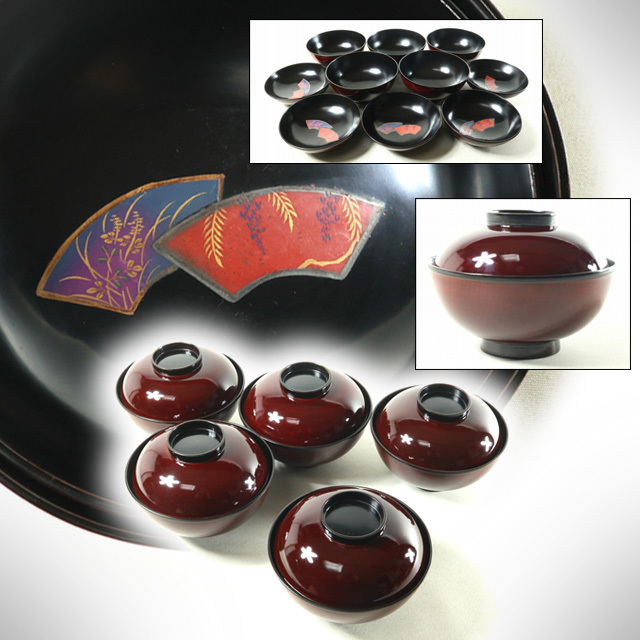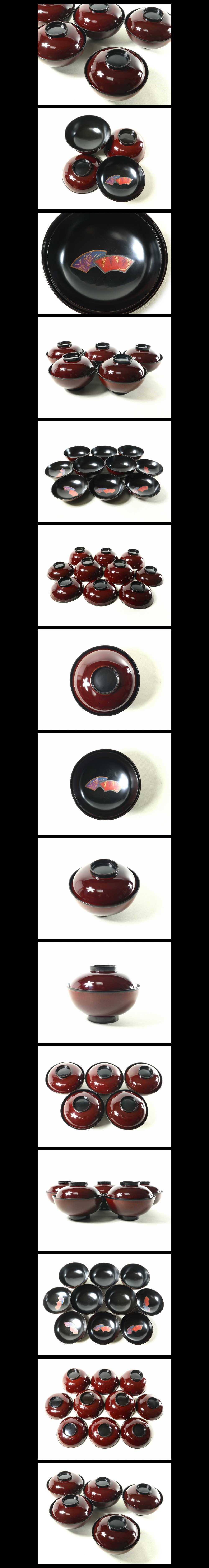 ●c1050●【見返り内蒔絵吸物椀5客 扇絵 塗分紅溜内黒/煮物椀】検お茶会煎茶道具茶懐石輪島塗京漆器紅春慶漆絵●西瓜●