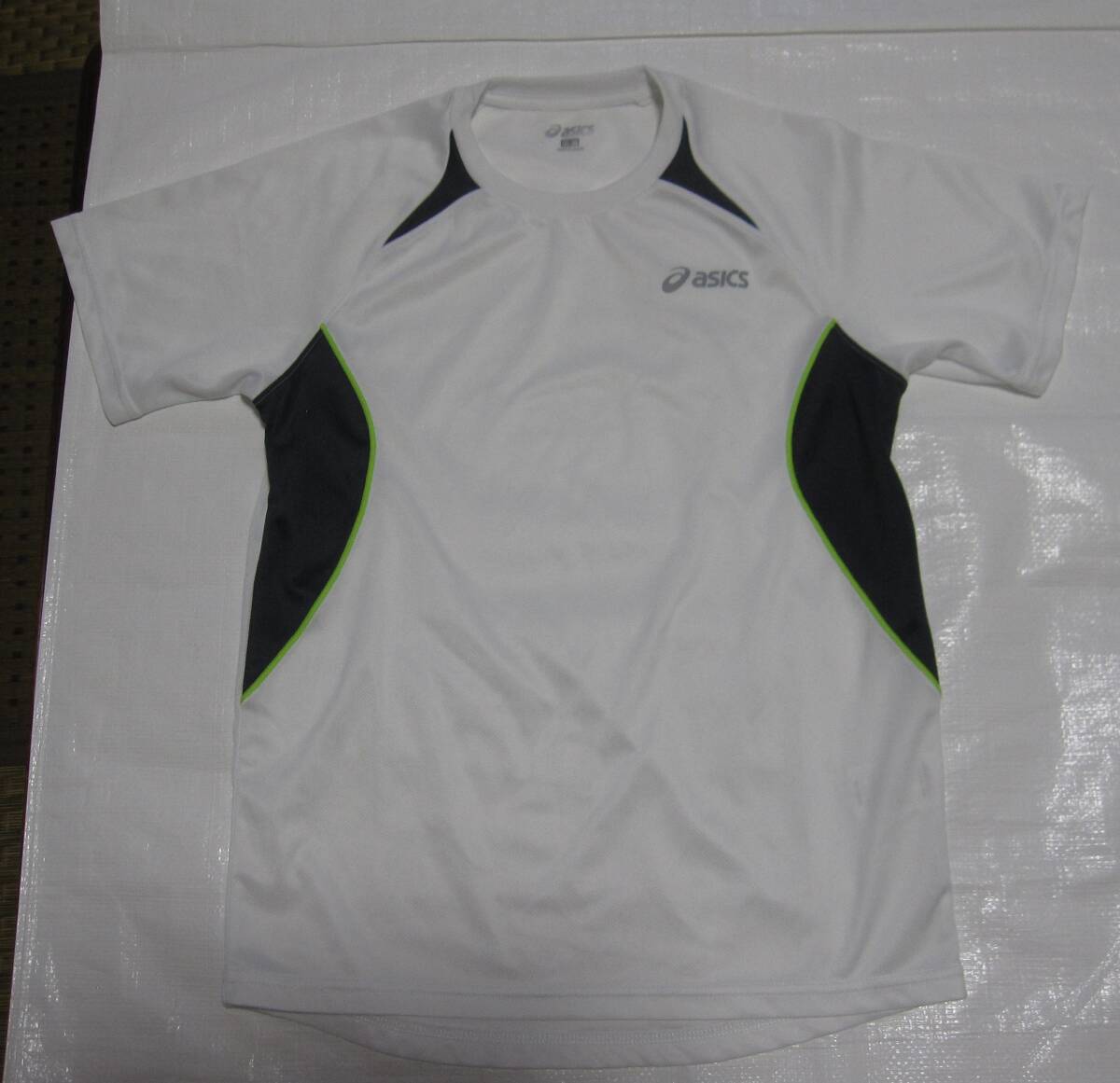 - アシックス レディーズ S-M 半袖シャツ スポーツ 正規品 白*濃紺+緑ライン ASICS ストレッチ Tシャツ