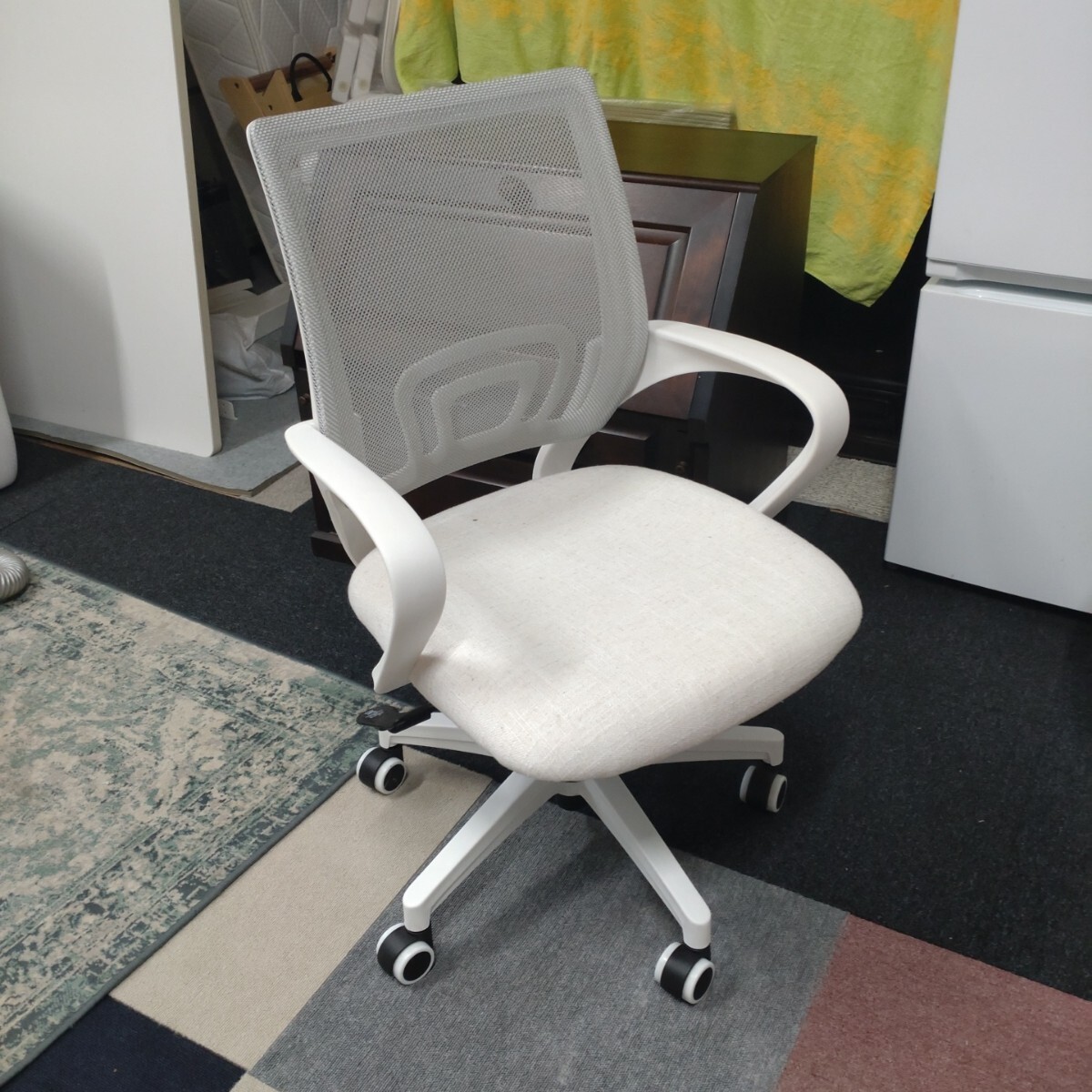 > 【店頭渡し推奨】 オフィスチェア 肘付 デスク チェア キャスター付き 昇降式 背面メッシュ ホワイト 中古 現状渡し
