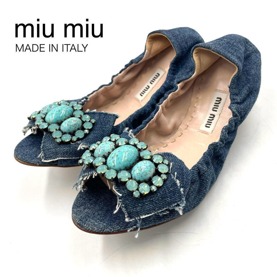 > 《未使用品》ミmiu miu ミュウミュウ フラット リボン パンプス バレエ ターコイズ デニム インディゴ ブルー 青系 35