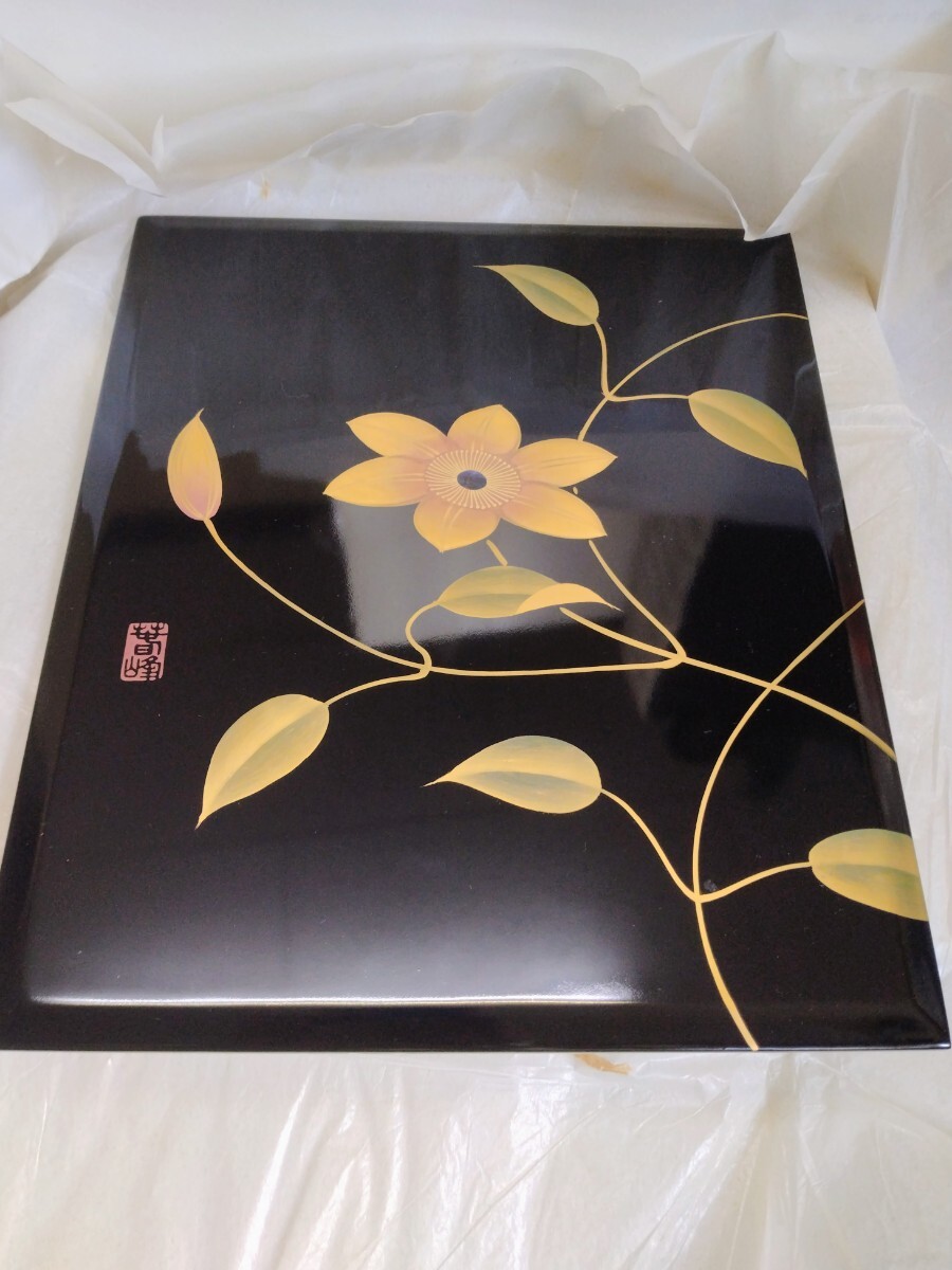 - K353【新品/長期保管】 会津塗 鉄仙 黒面取文庫 伝統消金粉手描蒔絵 春峰作 本金手描蒔絵 文箱 漆器
