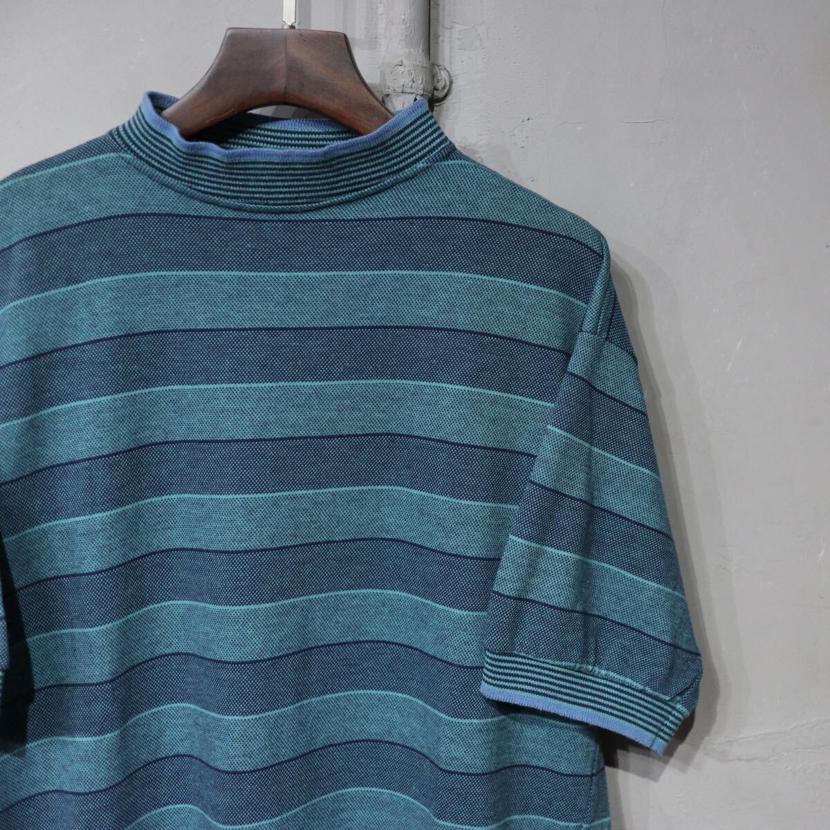 > 【即決】90s ボーダー モックネック Tシャツ グリーン ブルー 緑 青 USA アメリカ製 古着 XL