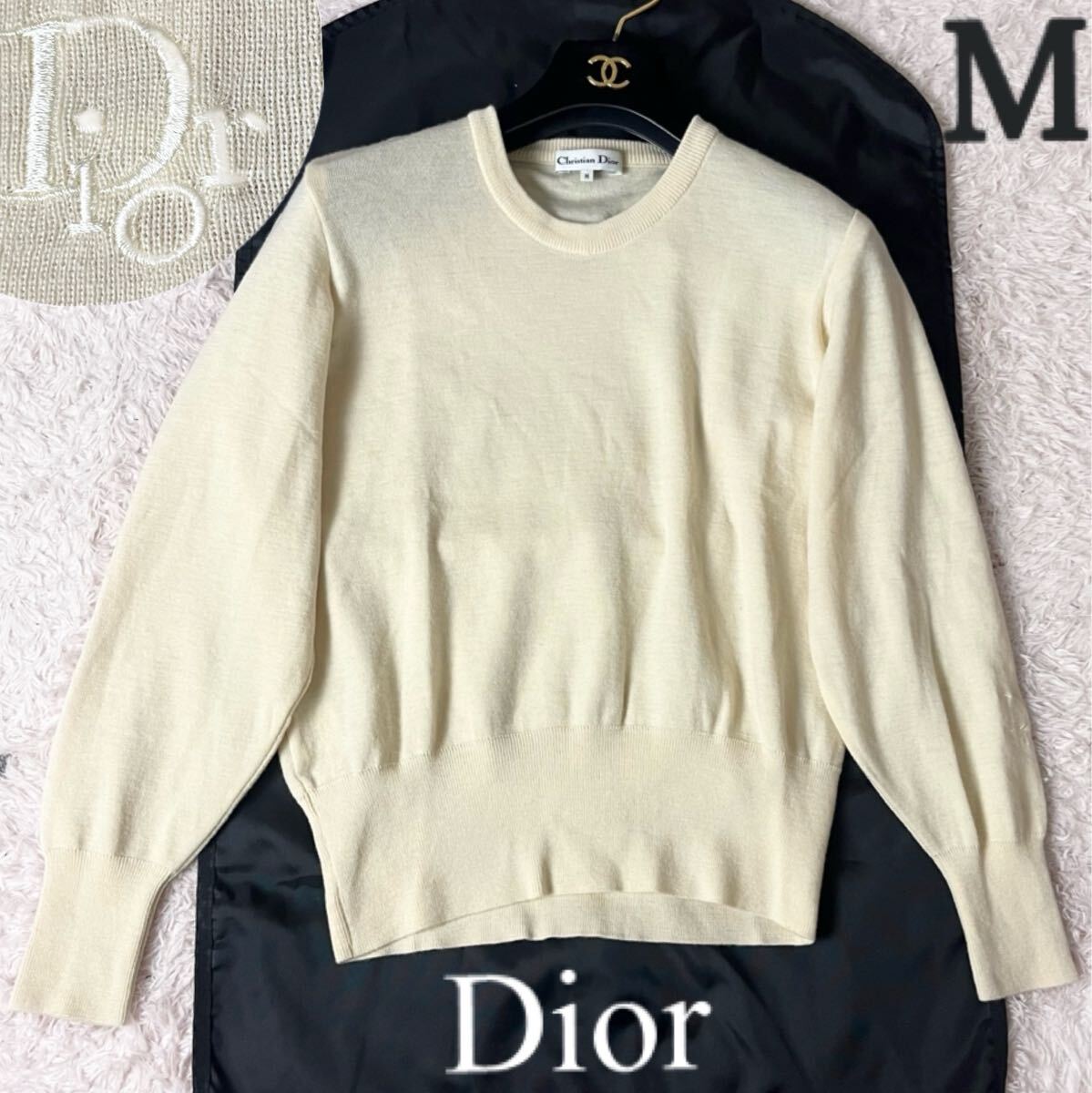 > Christian Dior クリスチャンディオール ブランドロゴ ニット セーター ウール ワンポイント刺繍 白 ホワイト M クルーネック ロゴ刺繍