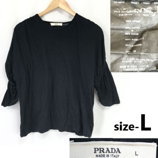 - プラダジャパン正規代理店タグ/イタリア製★/PRADA★シャーリングスリーブ/半袖カットソー/Tシャツ【レディースL/黒/black】Tops◆pBH870