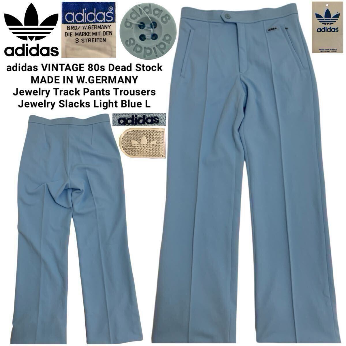 - adidas VINTAGE アディダス ヴィンテージ 80s デッドストック MADE IN W.GERMANY ジャージ ポリスラックス ライトブルー サフブ アーカイブ