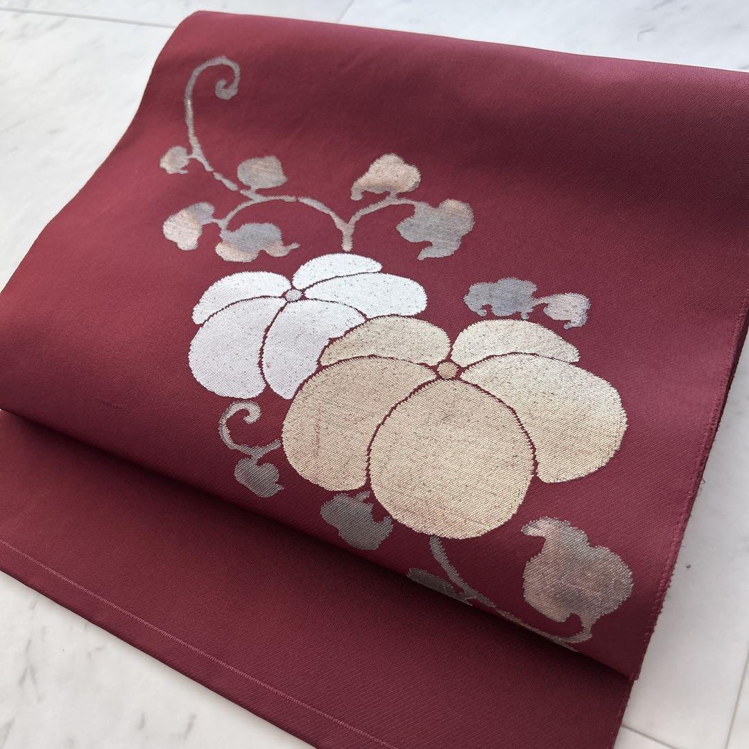 - 開き仕立て 名古屋帯 えんじ色 金銀糸花柄 お太鼓柄 355cm