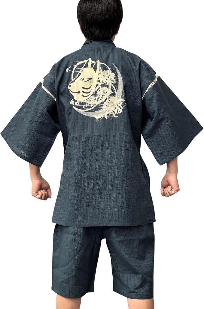 - [江戸てん] 訳あり LLサイズ 甚平 しじら織り 抜染 柄入り 狐面と彼岸花 グレー