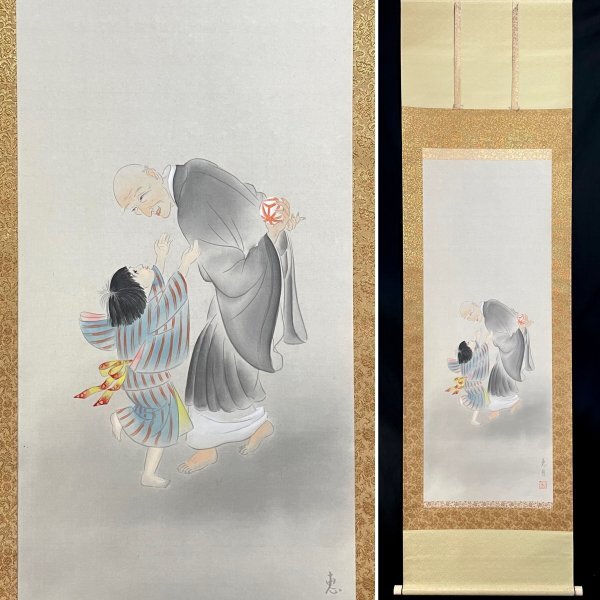 - H13M09[真作]杉本恵月「良寛手まり図」掛軸 紙本 人物画/良寛 手毬 童