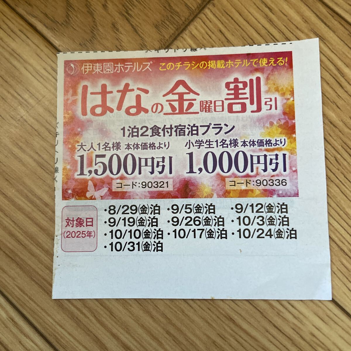 - 伊東園ホテルズ はなの金曜日割引 1500円引 10/31泊分まで