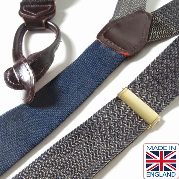 - 英国製 ヘリンボーン織柄×レザー ボタンタブ式 Y型 サスペンダー 紺系 Yバック ブレイシーズ スーツ ビジネス 映画 小道具 D152-52-0005