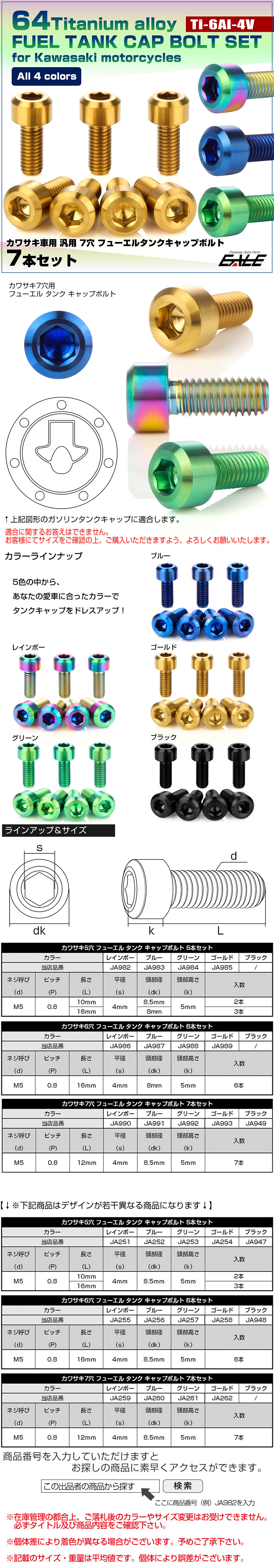 > 64チタン カワサキ7穴 ガソリンタンクボルト タンクキャップ ボルト 7本組 ZRX1100/400等 レインボー JA990