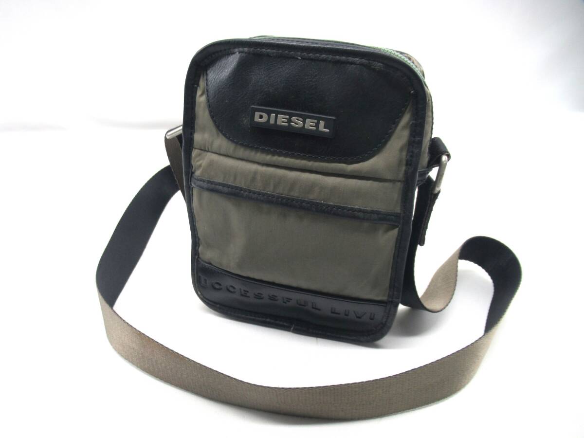 > 【送900円】939 DIESEL ディーゼル ショルダーバッグ ポシェット レザー×ナイロン カーキ クロスボディ シルバー金具 内オレンジ