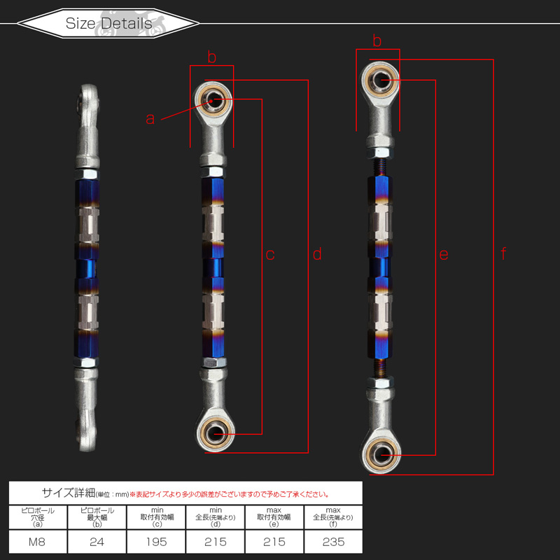 > 汎用 ブレーキ トルクロッド Sサイズ 取付幅195-215mm カラー シルバー/ブルー 焼きチタン色 タイプA ターンバックル ピロボール TH0059