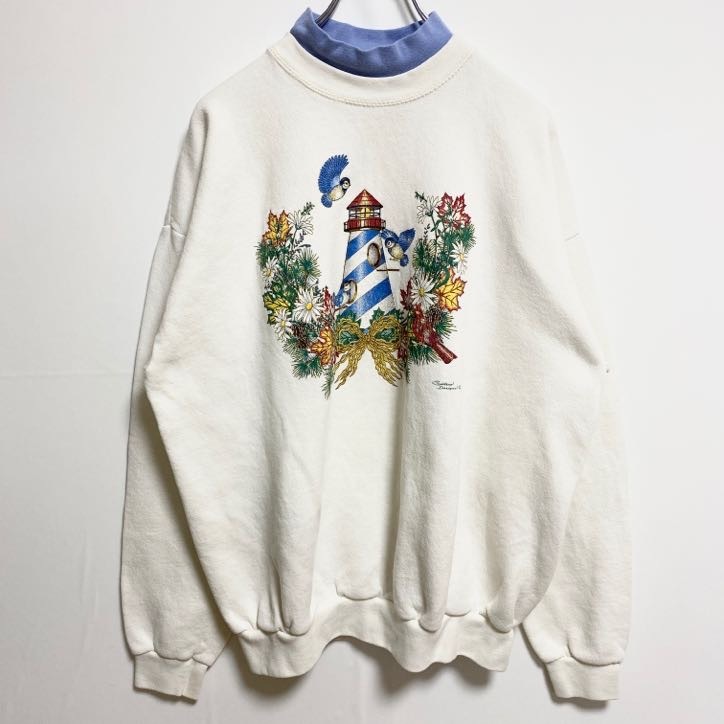 - 古着 used ~90s プリントスウェット/トレーナー 鳥 花 白 ヴィンテージ ビッグシルエット XLサイズ