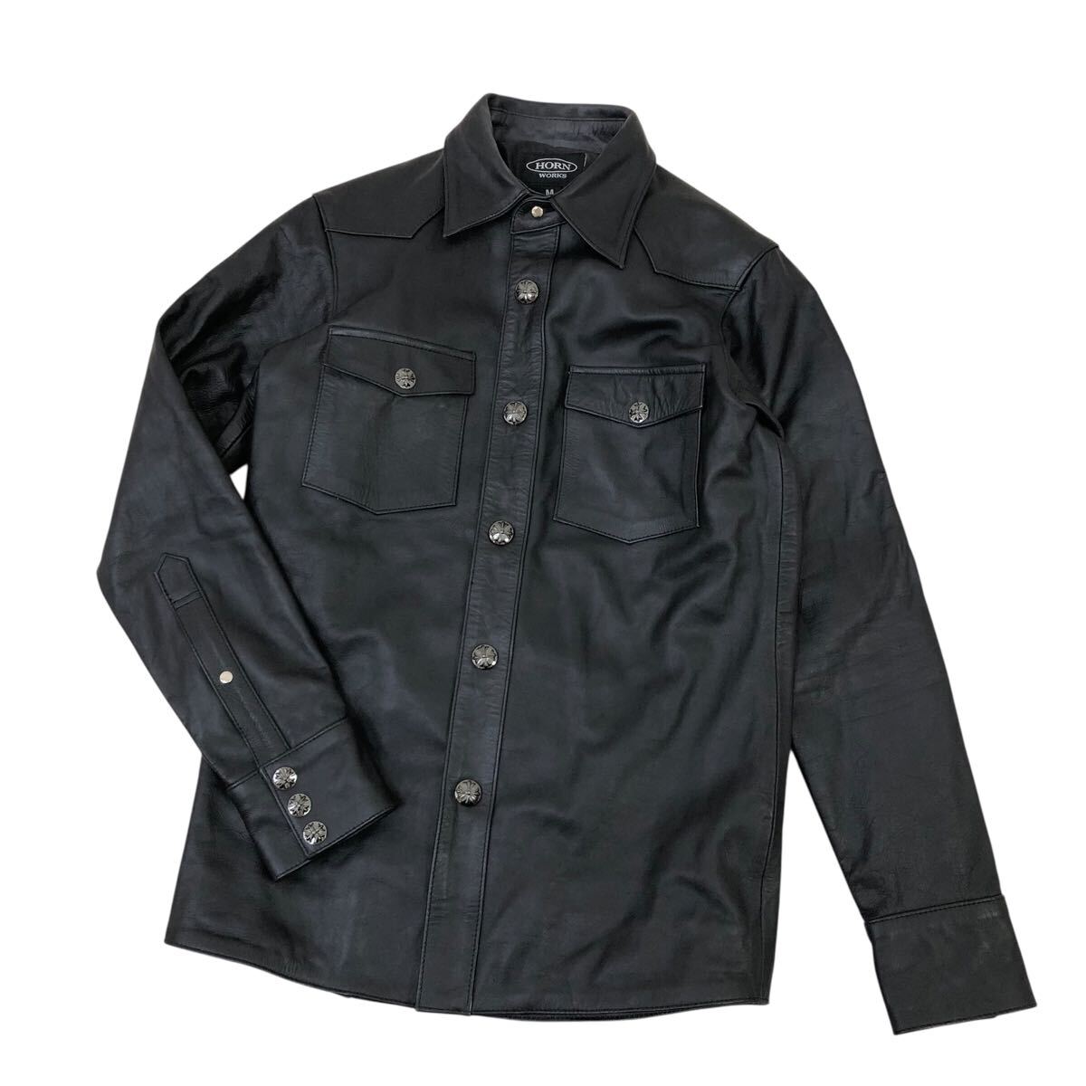 - ※9H-65 良品 本革 HORN WORKS ホーンワークス 牛革 レザー ジャケット シャツジャケット 上着 黒 ボタン メンズ M