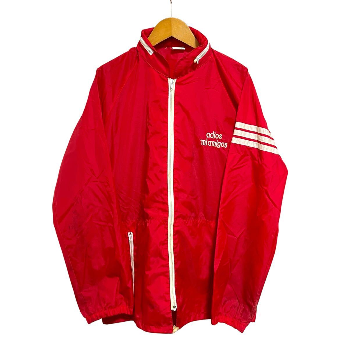 - ※N 80s〜 ナイロンジャケット レッド ジップアップ フード付き 刺繍 日本製 サイズL