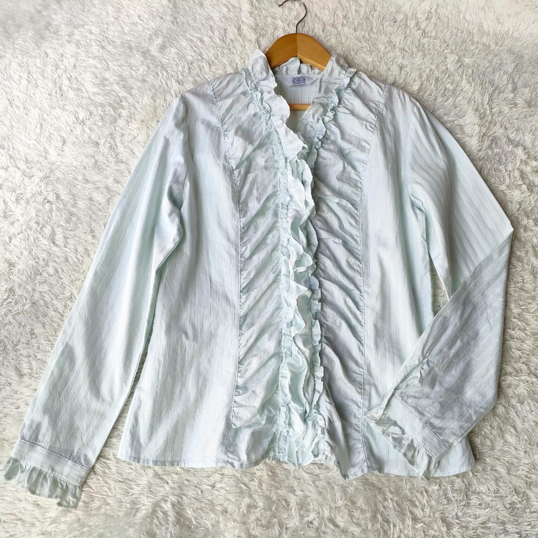 - J.PRESS ジェイプレス フリル ストライプ シャツ ブラウス 11 L ライトグリーン オンワード樫山