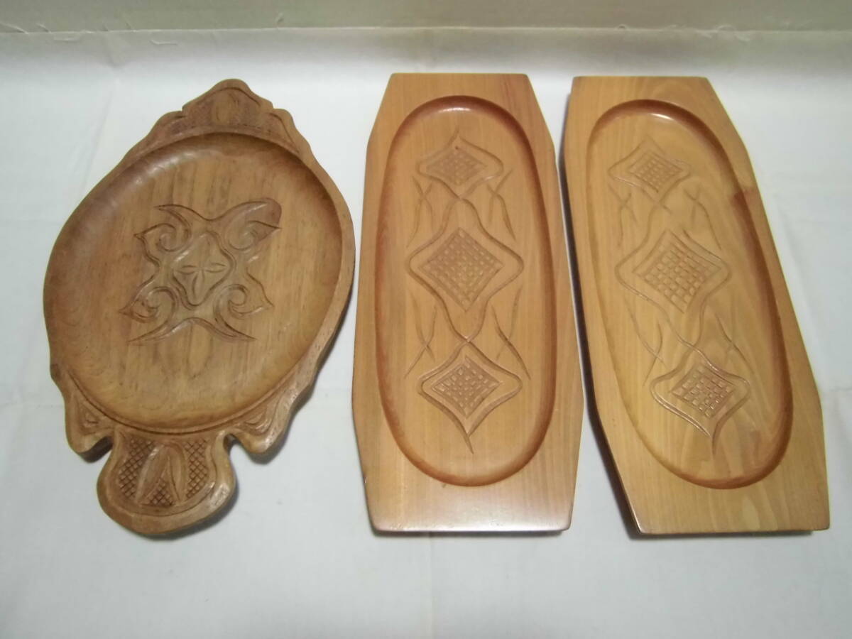 > プレート皿 木製 魚形 1枚 長方形 2枚 計3枚 木彫 ワンプレート 盛皿 刳り抜き 刳り貫き 食器 小物入れ ペントレーなど 工芸品 レトロ