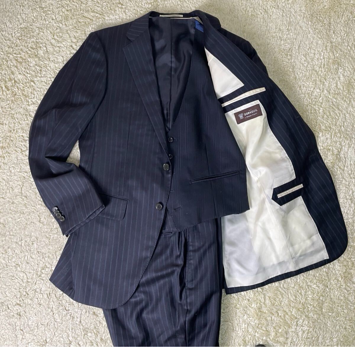 - 【美品】TAKIZAWA SHIGERU ×DORMEUIL タキザワシゲル×高級生地ドメール スーツ セットアップ3ピース ネイビーストライプ