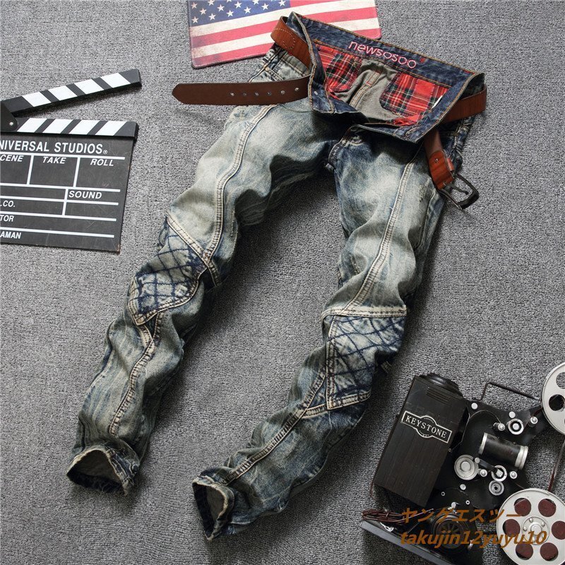 > ジーンズ 新品 デニムパンツ メンズ ジーパン 切替 ストレート スキニー ダメージ加工 ヴィンテージ バイクパンツ トレンド 選択可 W32