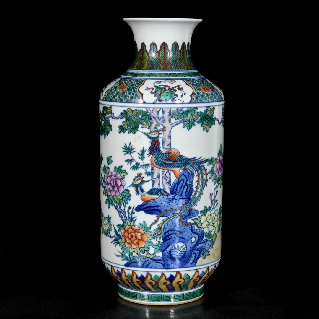 - 9_ZZ8433【惠】人間国宝 中国骨董 陶芸 磁器【清乾隆斗彩花鳥鳳戯牡丹紋筒子瓶】工芸品 施釉陶 青花磁 陶芸 置物 收藏品