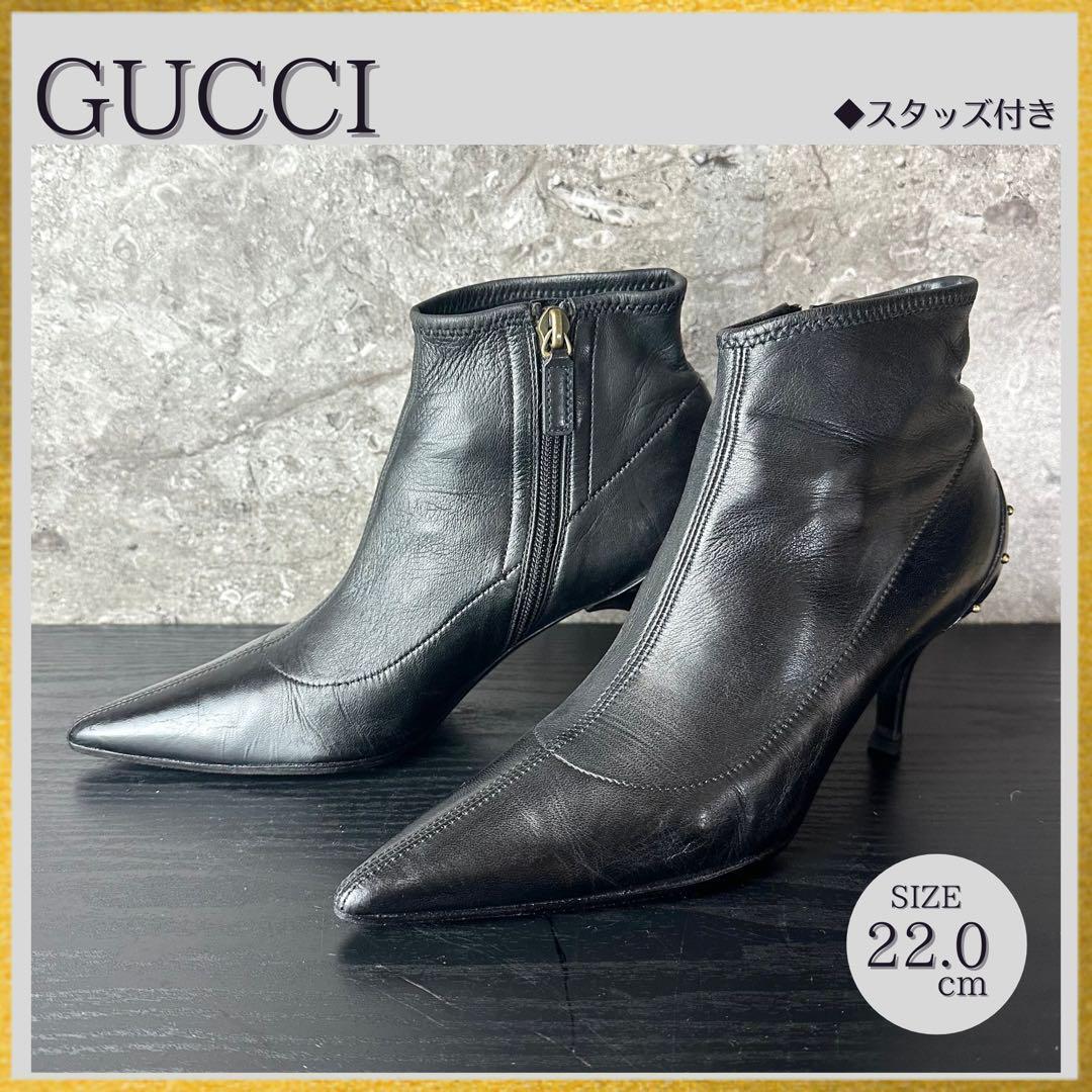 - S10 GUCCI グッチ ポインテッドトゥ ブーティ ショートブーツ サイドジップ スタッズ 黒ブラック 35(22cm)