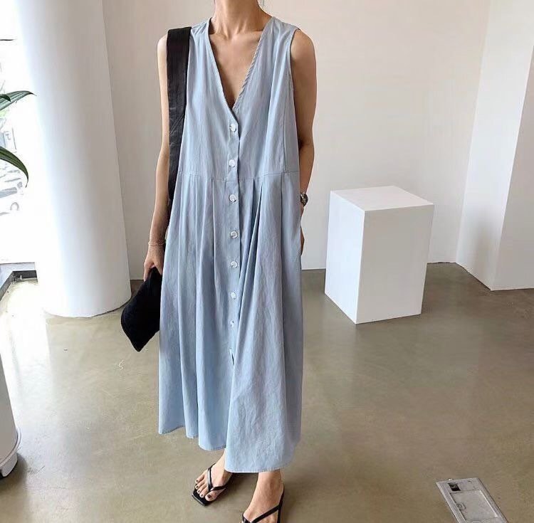 - ロングワンピース ジャンパースカート ノースリーブ 袖なし Vネック シンプル カジュアル レディース M ブルー